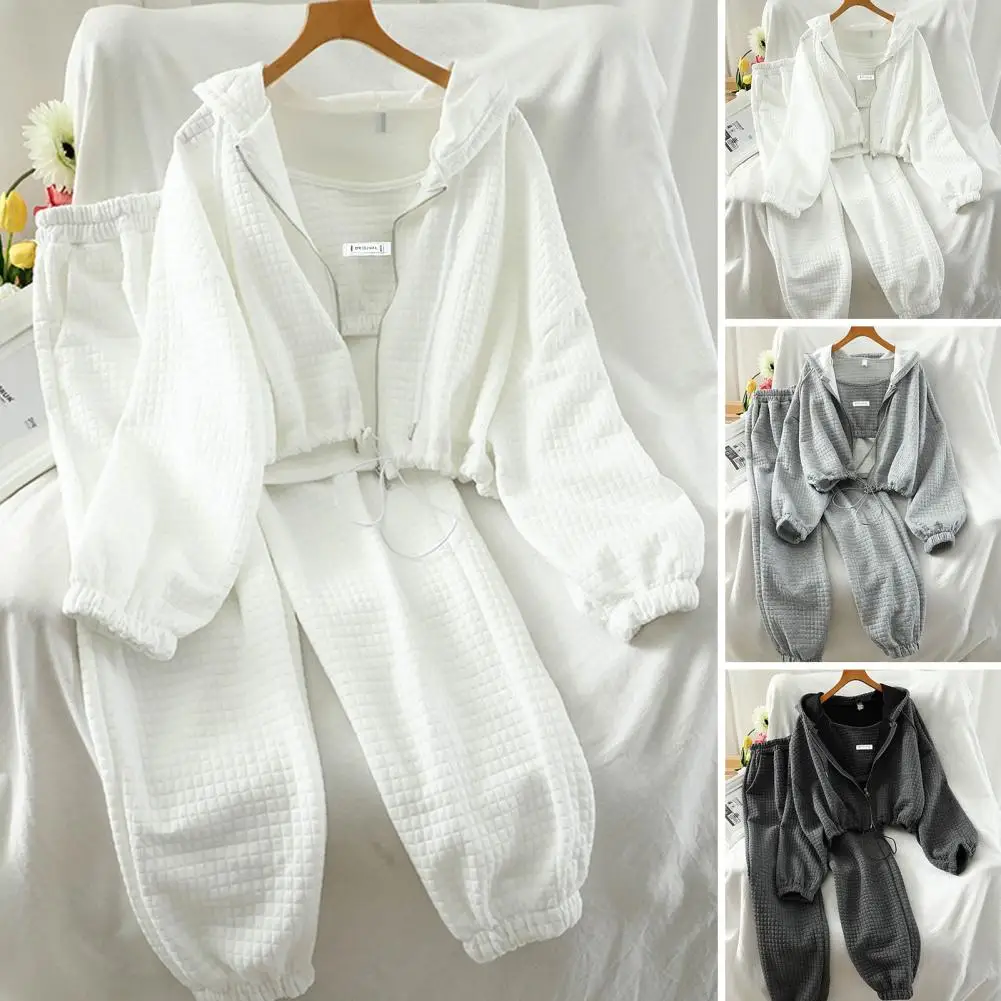 3Pcs/Set Women Autumn Winter Sport Outfit Sling Vest Hooded Long Sleeve Zipper Placket Coat Elastic Waist Sweatpants Set